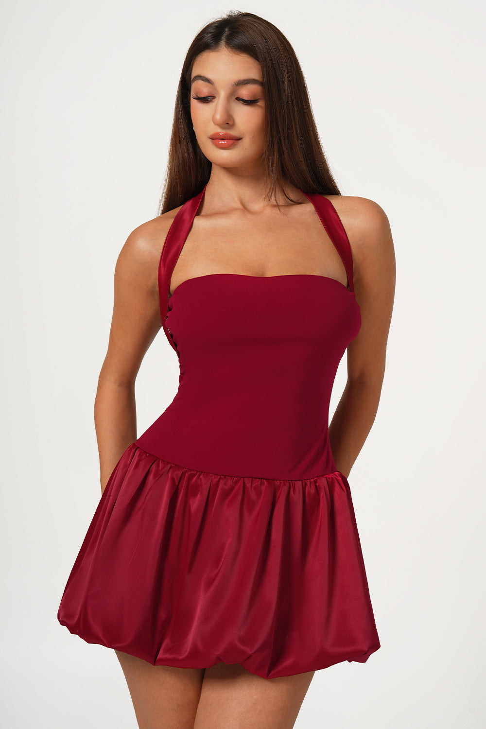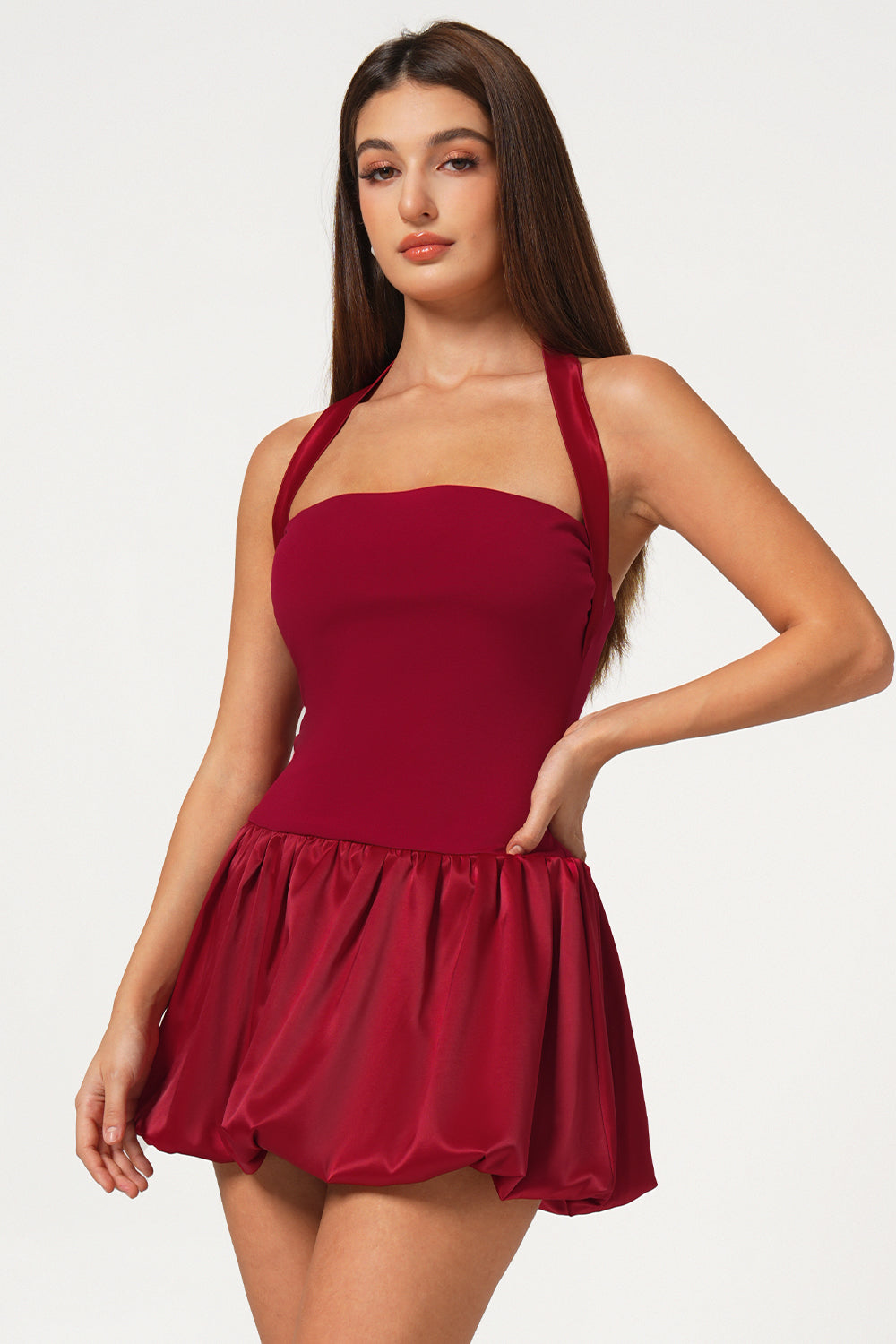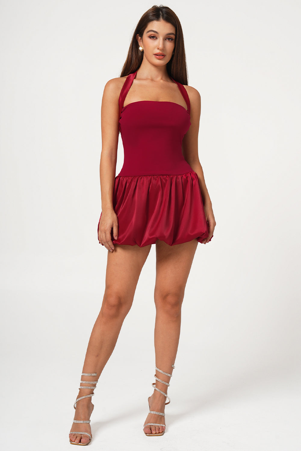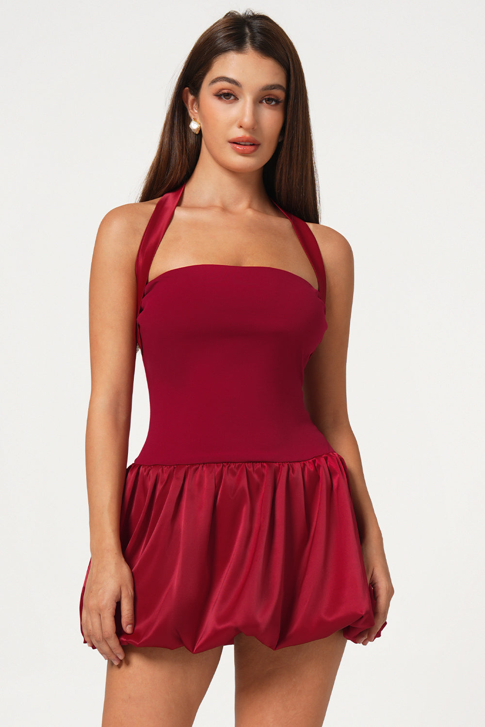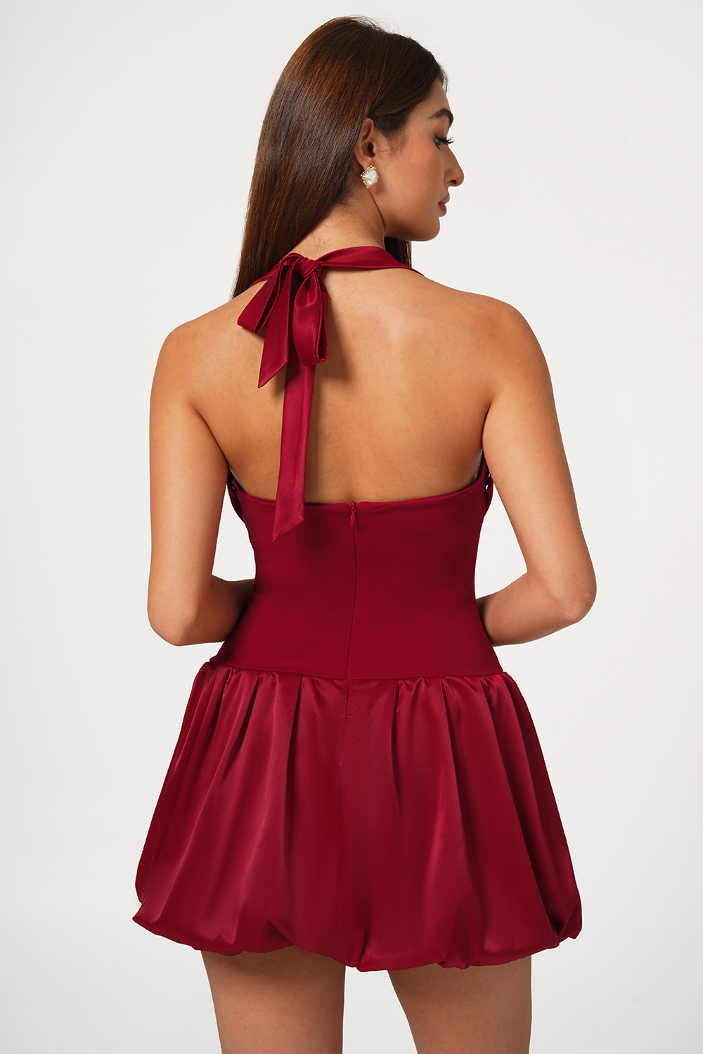 Red Satin Lace-Up Bubble Hem Mini Dress